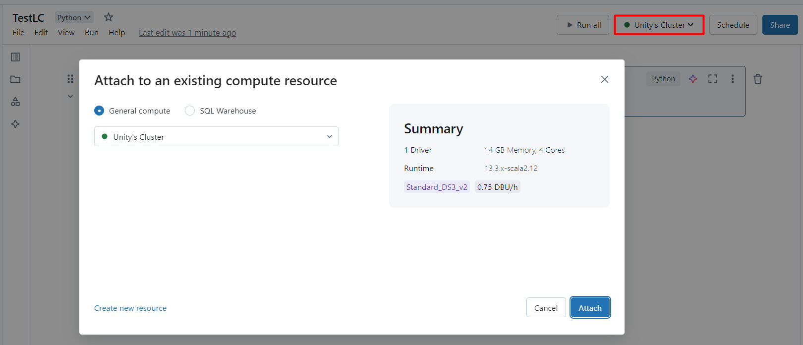 JAR ファイルがインストールされたら、Databricks でリアルタイムSAP のデータを操作する準備が整いました。まず、ワークスペースで新しいノートブックを作成します。ワークブックに名前を付け、言語として Python が選択されていることを確認し(デフォルトで選択されているはずです)、「Connect」をクリックして「General Compute」から JDBC ドライバーをインストールしたクラスターを選択します(デフォルトで選択されているはずです)。