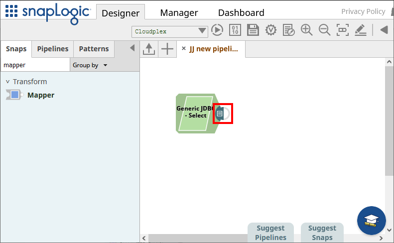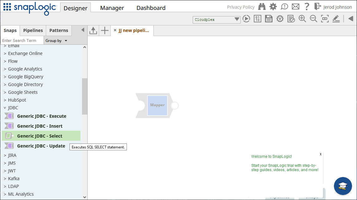 - Snaps から「JDBC」を展開し、「Generic JDBC - Select」snap をデザイナーにドラッグします