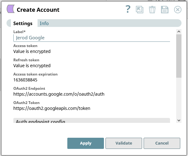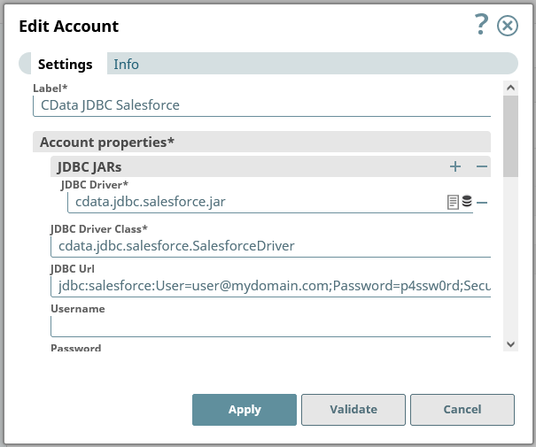 - 接続プロパティを入力したら、「Validate」をクリックし、「Apply」をクリックします