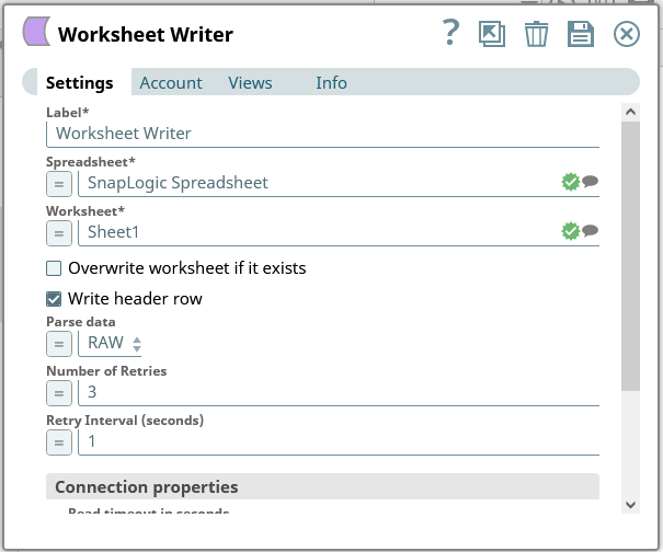 - Worksheet Writer snap を設定して、SAP Fieldglass のデータ を Google スプレッドシートに書き込みます