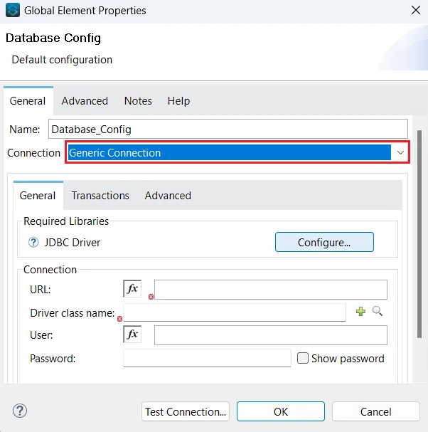 - Database Config ダイアログのConnection ドロップダウンからGeneric Connection を選択します。