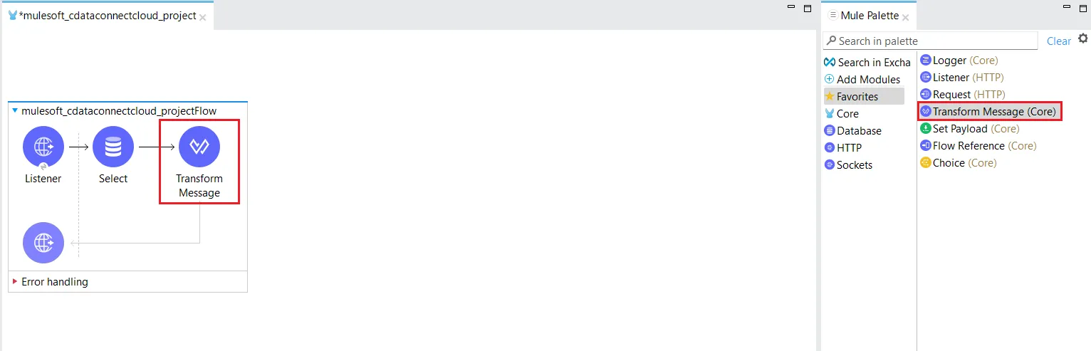 - Mule Palette で、Transform Message をMessage Flow エリアにドラッグします。