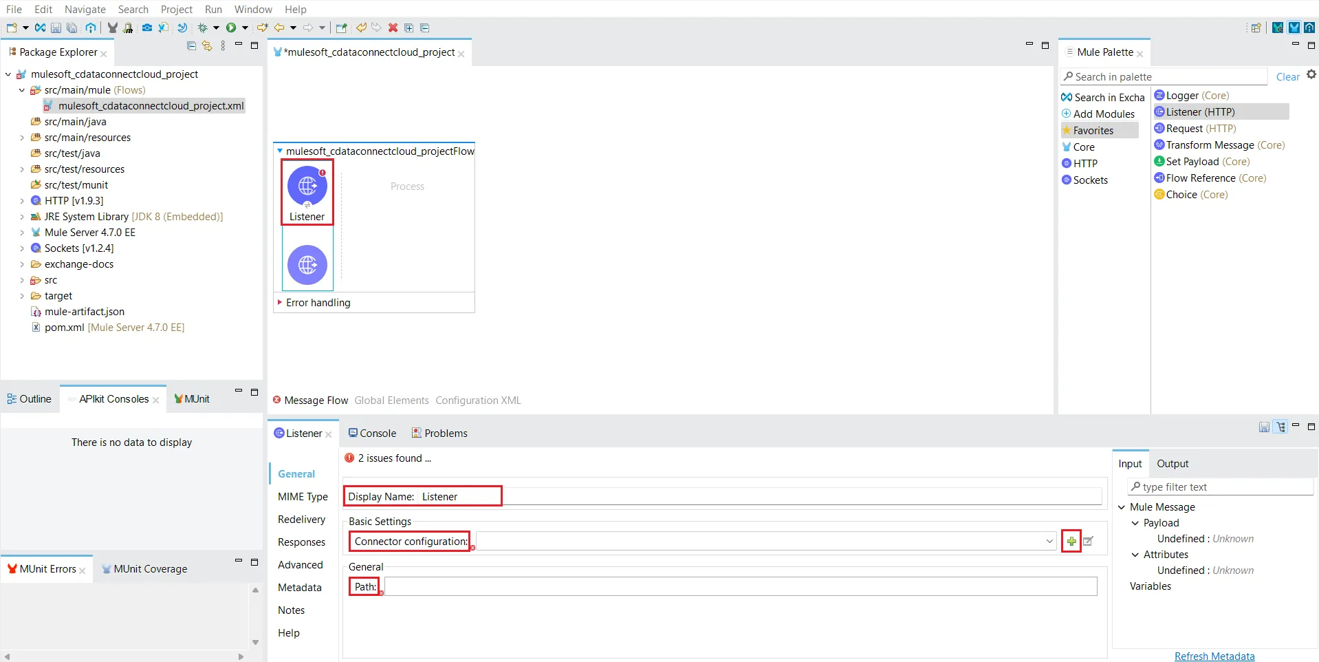 - 右側のMule Palette で、HTTP Listener をMessage Flow エリアにドラッグします。