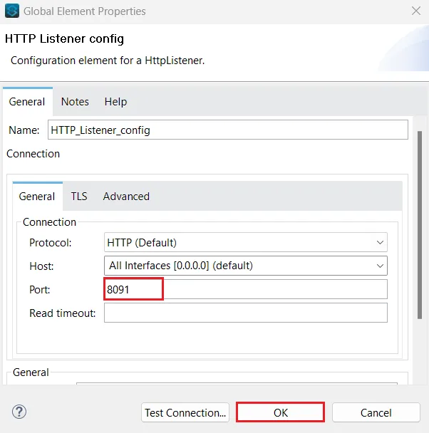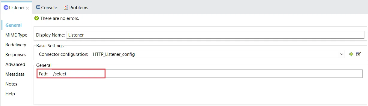 - Connector configuration の右側にある+ 記号をクリックします。HTTP Listener 設定ダイアログが表示されます。