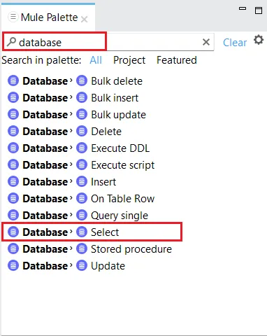 - 右側のMule Palette で、検索バーにdatabase と入力します。