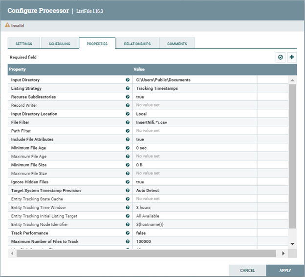- ListFile プロセッサの設定:Input Directory プロパティを、CSV ファイルを取得するローカルフォルダパスに設定します。 File Filter プロパティを、名前が式に一致するファイルのみを選択する正規表現に設定します。 例:CSV ファイルのフルパスがC:\Users\Public\Documents\InsertNiFi.csv の場合、プロパティは以下の画像のように設定します: