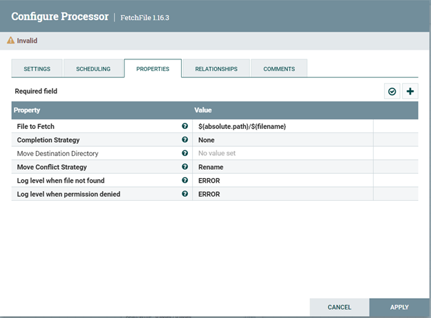 - FetchFile プロセッサの設定 FetchFile プロセッサのプロパティ設定はデフォルト値のままにします: