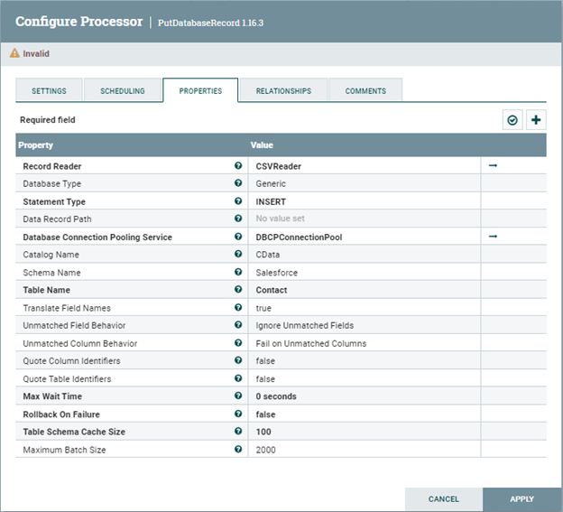 バッチINSERT 操作を実行するには、PutDatabaseRecord プロセッサを以下のように設定します: