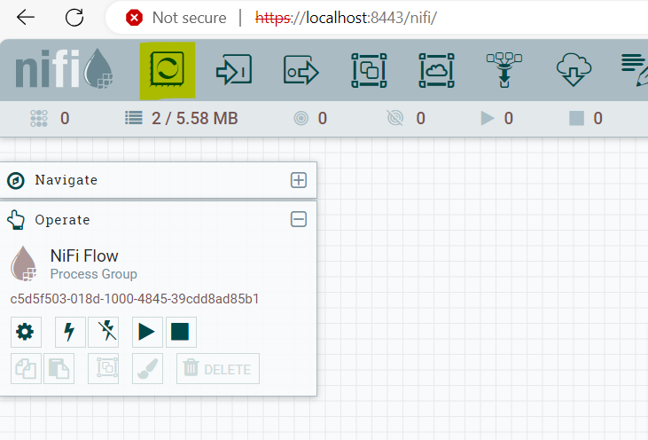 注意:古いバージョンの Apache NiFi を使用している場合は、http://localhost:8080/nifi からアクセスする必要があります。以前のバージョンでは HTTP プロトコルが使用されていましたが、最新バージョンでは HTTPS が標準になっています。デフォルトでは、HTTP はポート 8080 で動作し、HTTPS はポート 8443 を使用します。
