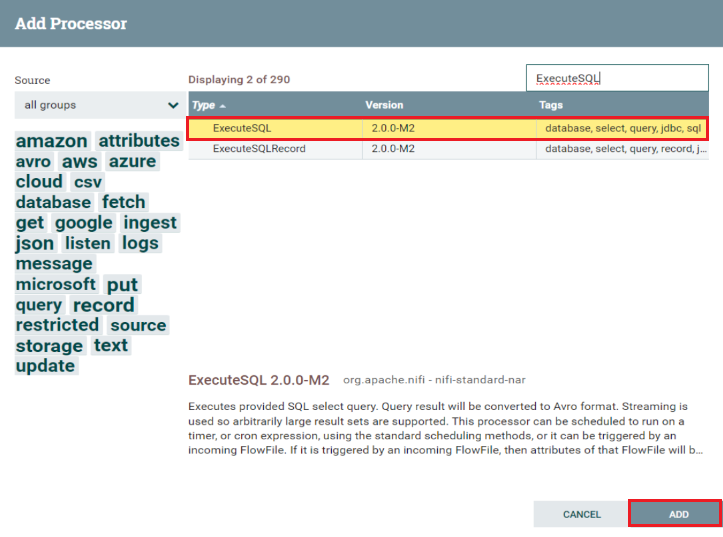 - 「ExecuteSQL」プロセッサーを選択し、「Add」ボタンをクリックしてワークスペースに表示させます。