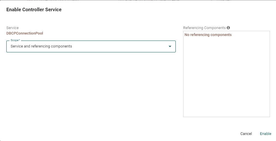 - 「Enable Controller Service」ウィンドウで、Scope を「Service and referencing components」に設定します。