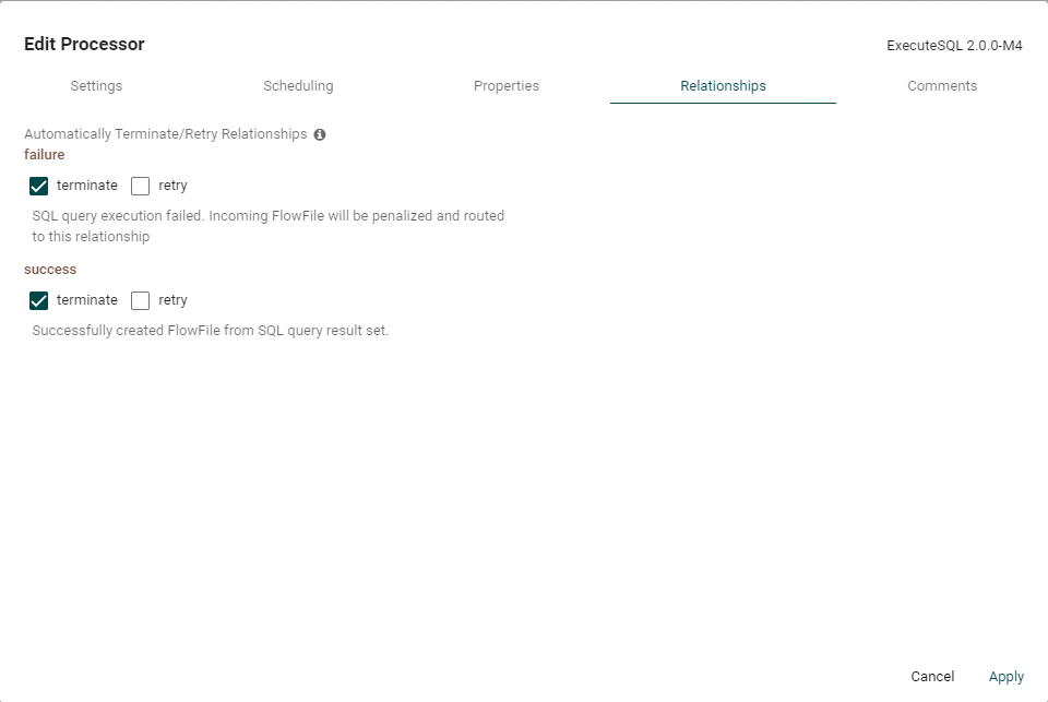 - Relationships に移動し、実行プロセスの成功時と失敗時にコンポーネントがどのように処理を進めるかのオプションを選択してください。