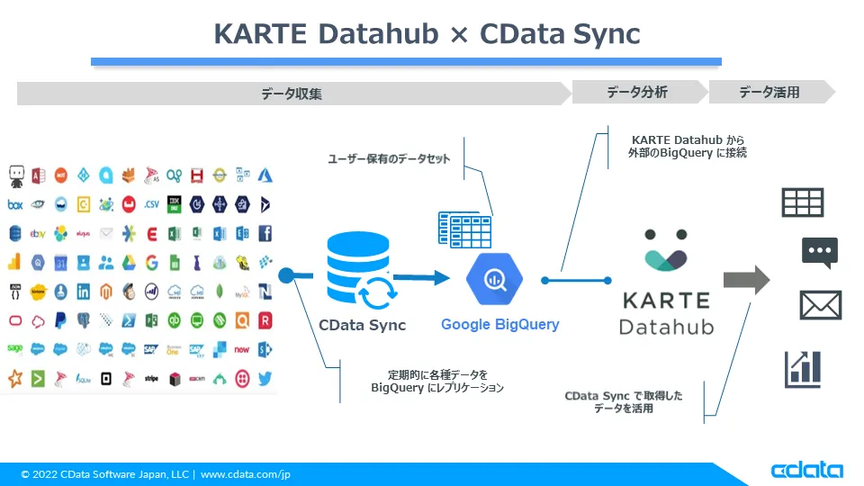 いかがでしたでしょうか。今回はCData Sync を使ってQuickBooks Time からKARTE Datahub が参照できるBigQuery のデータセットにデータをレプリケーションしてみました。これによりKARTE が計測しているリアルタイムな顧客情報とQuickBooks Time が保持している情報を掛け合わせて、より最適な情報を顧客にレコメンドするといったことができるになりました。今回はデータソースにQuickBooks Time を採用しましたが、他の SaaS や DB を指定しても同手順でKARTE Datahub で利用することができますので、ぜひユースケースに合ったデータソースでお試しください。