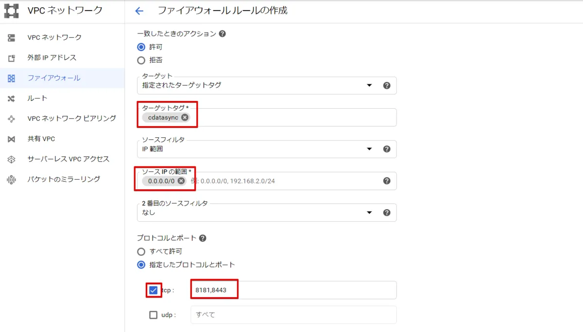 ファイアウォールの名前とターゲットタグを任意の名前で設定し、送信元のIP アドレスは今回は全て対象にするために「0.0.0.0/0」を設定しています。次に、「指定したプロトコルとポート」以下の「TCP」を選択し、 「8181,8443」を指定して、「作成」ボタンをクリックします。