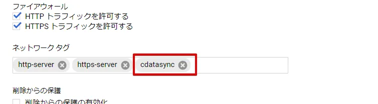 今度は先ほど作成したGCE のインスタンスを編集します。ネットワークタグにファイアウォールで作成したタグ(今回は「cdatasync」というタグを作成)を設定します。