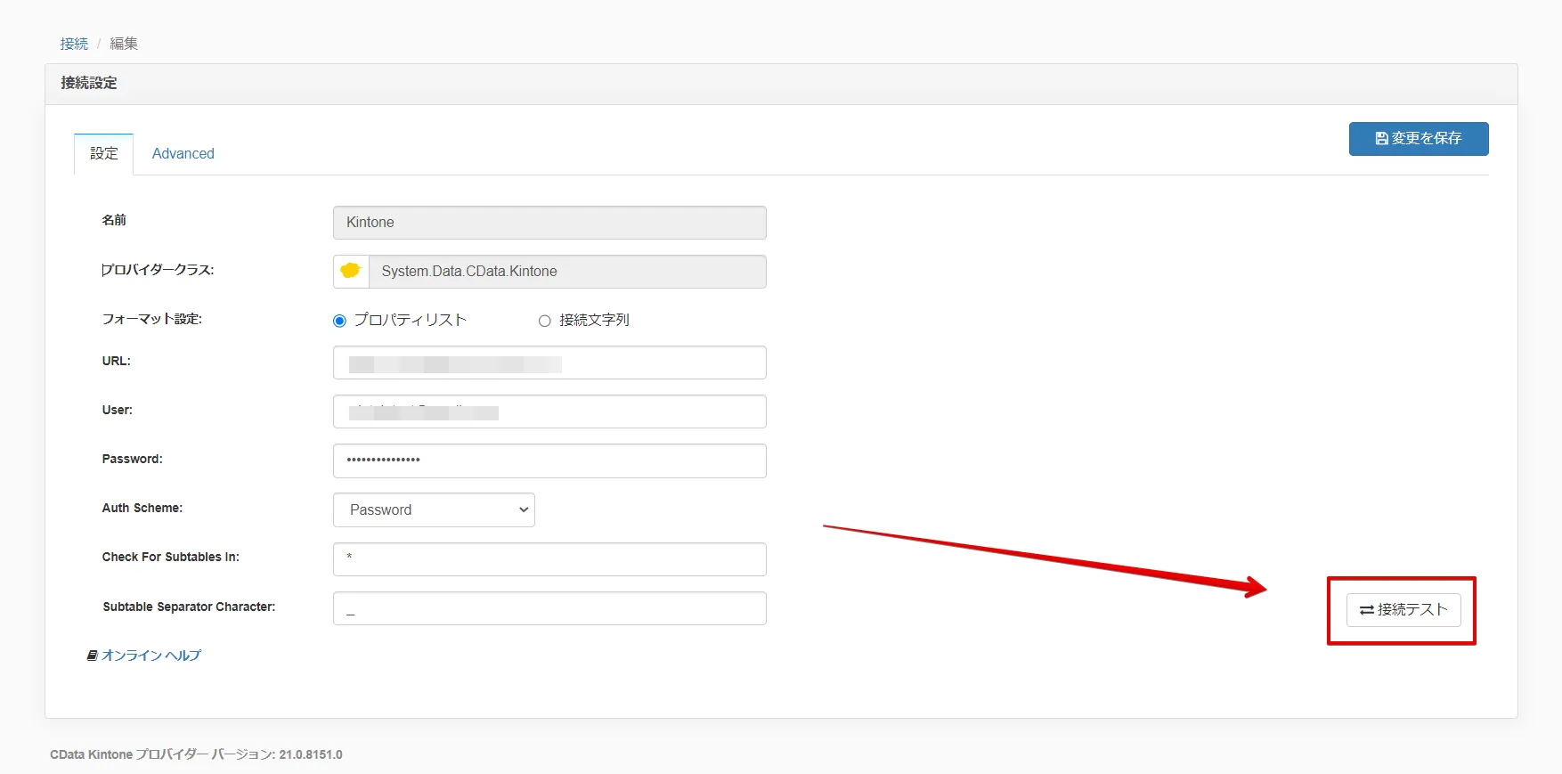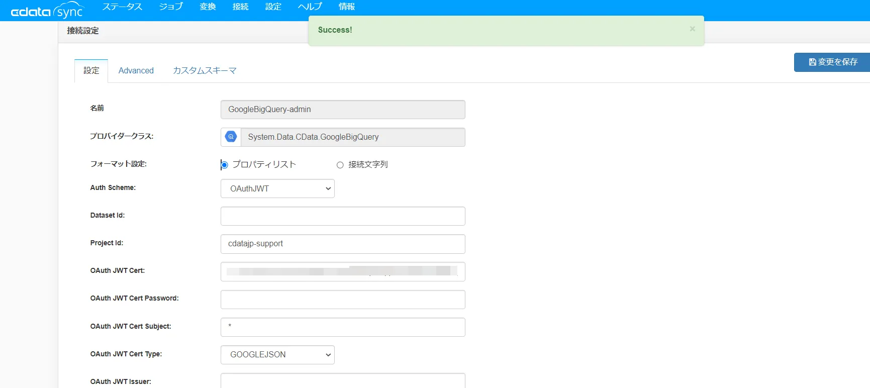 なお、KARTE Datahub から自身のBigQuery にアクセスするにはサービスアカウントが必要になりますので、CData Sync 上の接続設定でも上記項目を埋めてサービスアカウントで行っていきます。