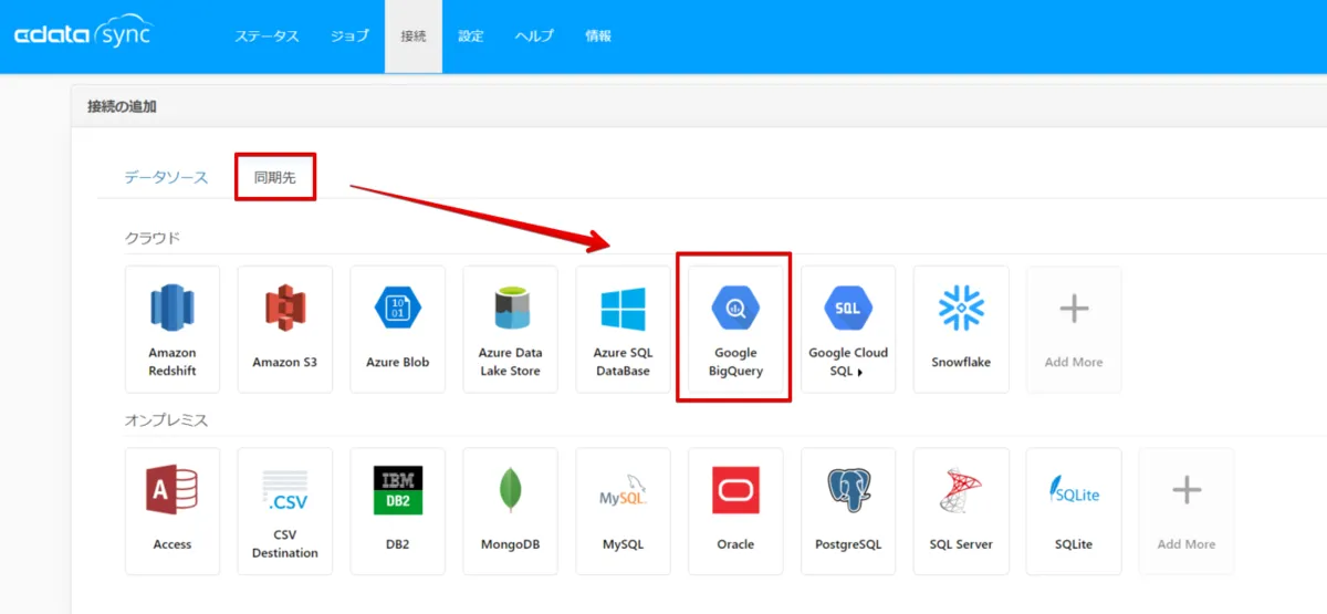 先ほどと同手順ですが同期先タブを選択してBigQuery アイコンをクリックします。