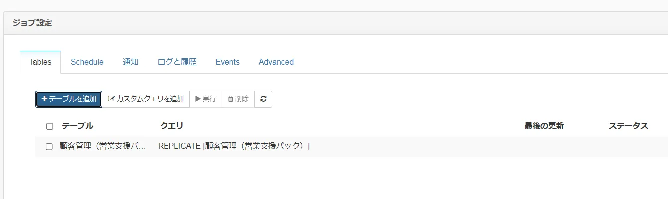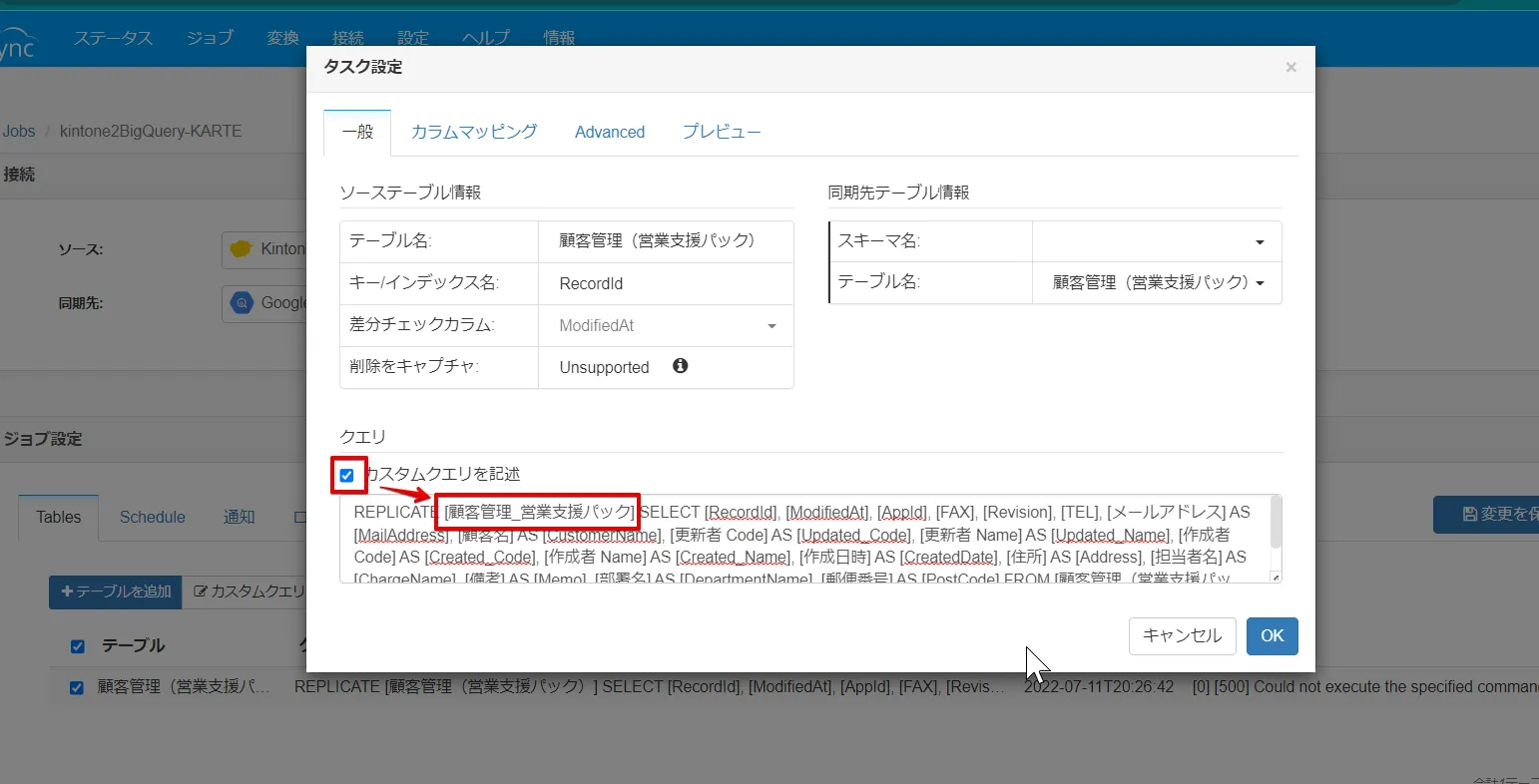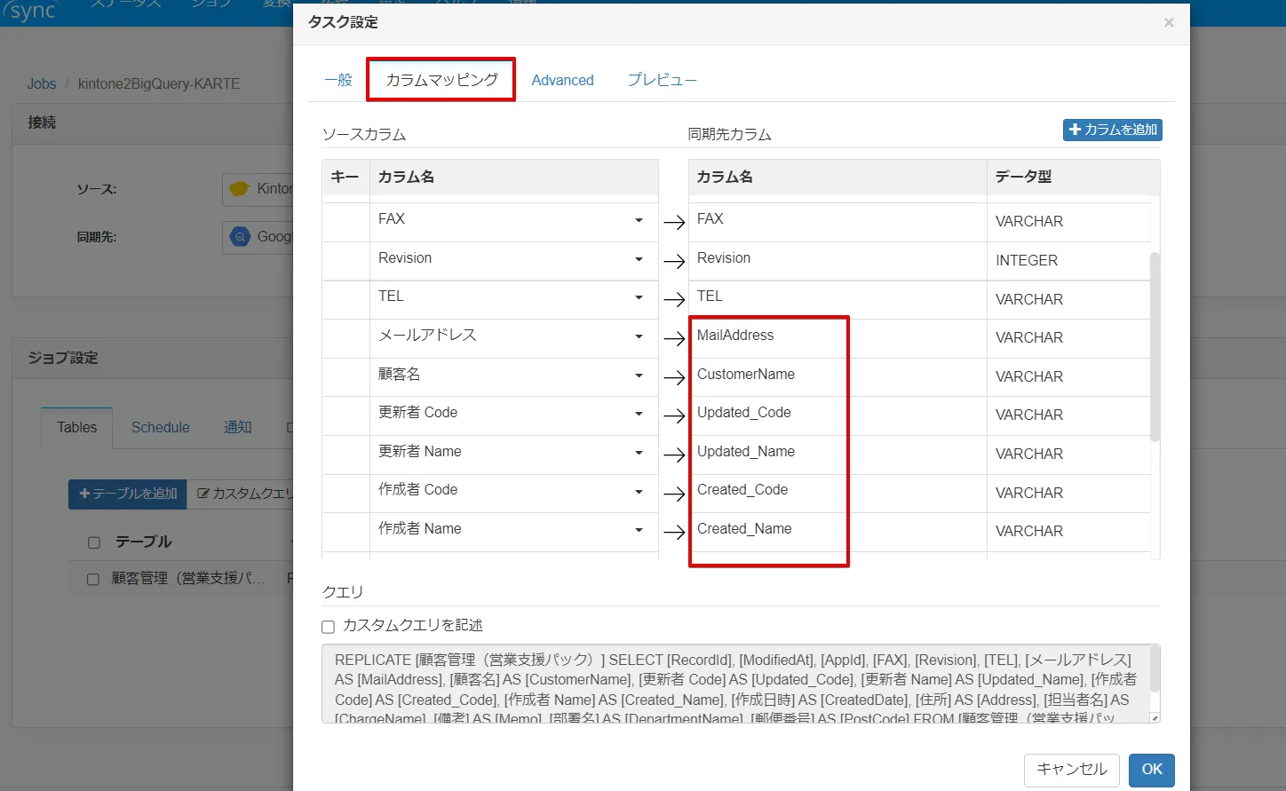 こちらの見方は、顧客管理(営業支援パック)というテーブル名でBigQuery にテーブルを作成してレプリケーションするという意味になってます。
