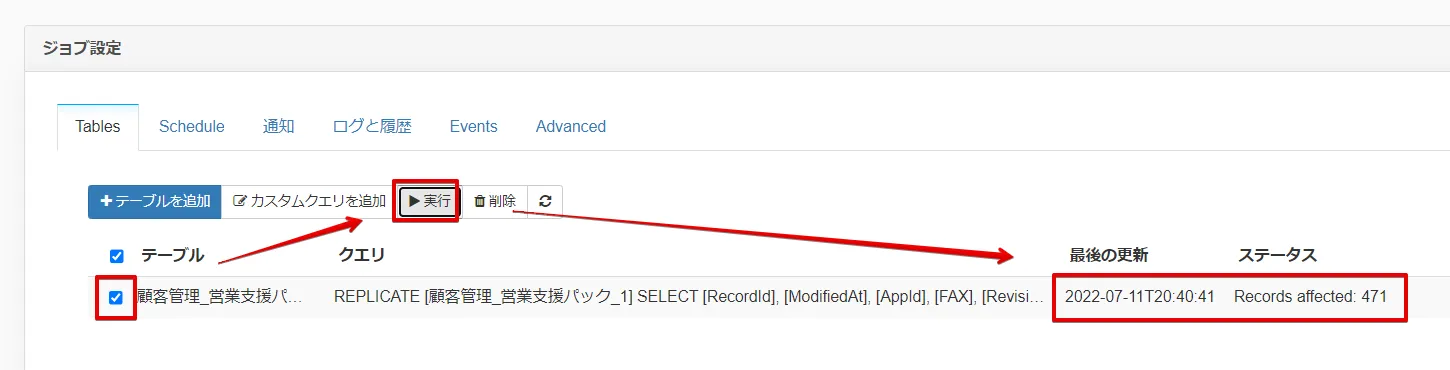 実行方法は作成したクエリにチェックを入れて実行ボタンをクリックするだけです。