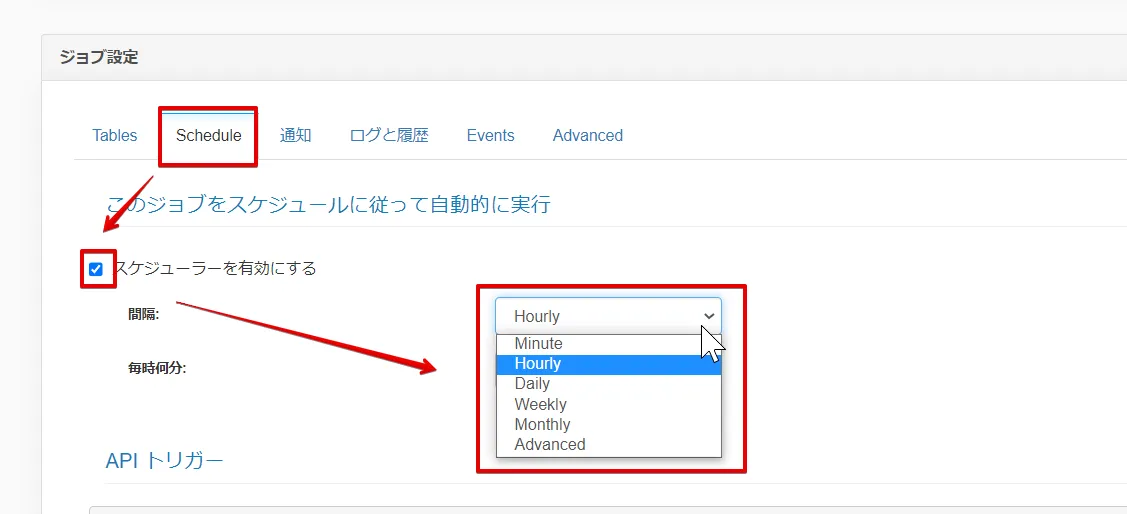 もし定期実行したい場合は「Schedule」タブにて指定することができます。
