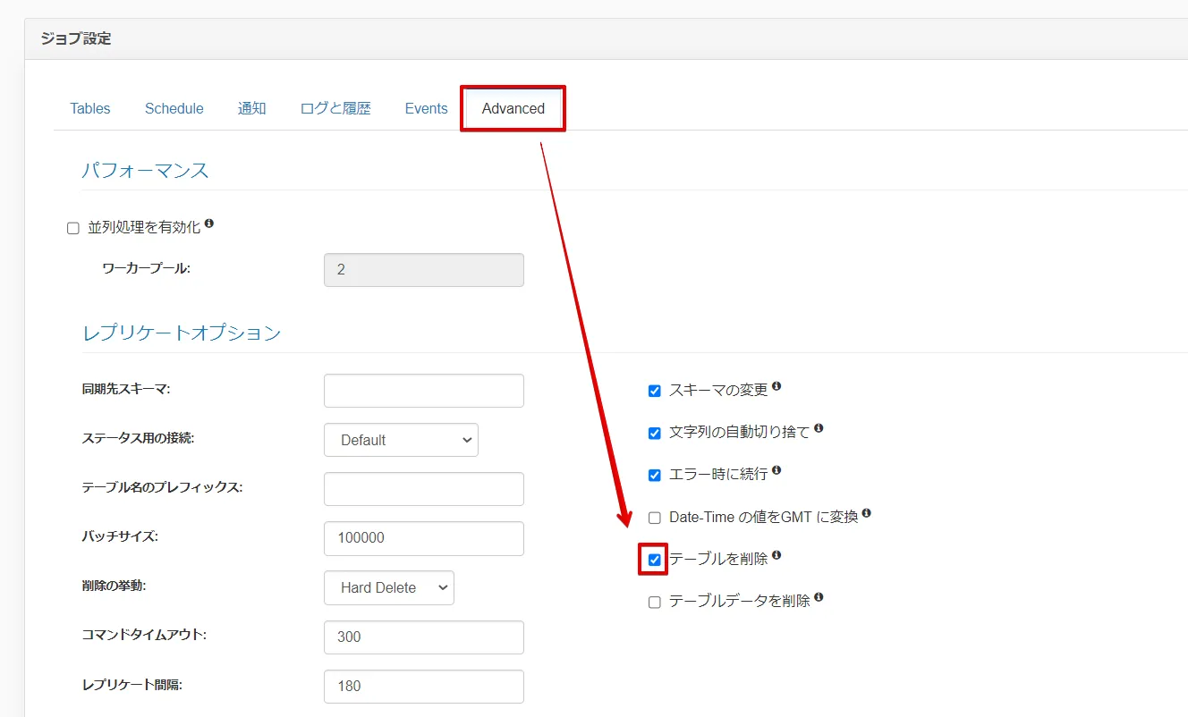 全件洗い替え方式は、ジョブオプションでテーブル削除にチェックを入れると有効になります。