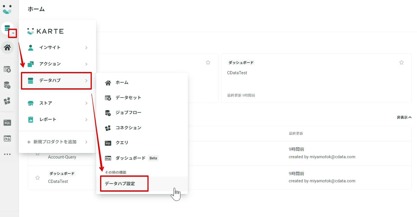 ログイン後、左のデータハブメニューからデータハブ→データハブ設定で進みます。