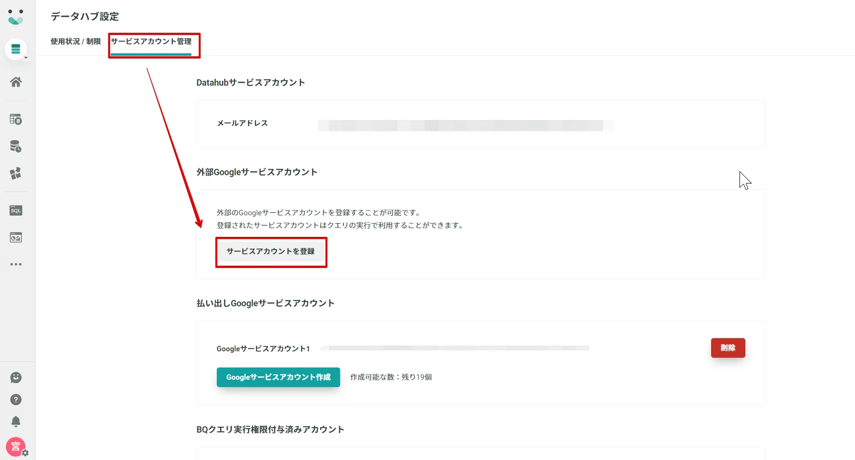 サービスアカウント管理タブからサービスアカウントを登録で外部のGoogle サービスアカウントを登録します。