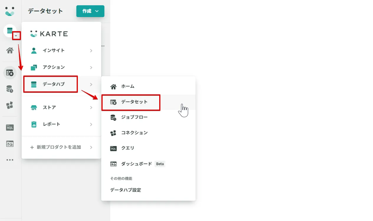 サイドメニューのKARTE Datahub メニューからデータハブ→データセットと進みます。