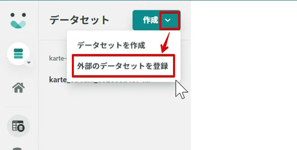 作成ボタンのメニューから外部のデータセットを登録をクリックします。