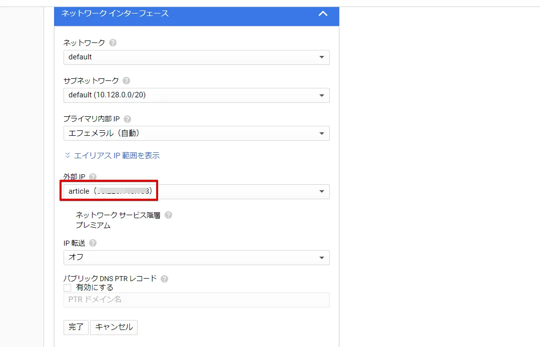 アドレスが毎回変わってしまうと接続できなくなってしまうため、ここで静的IP アドレスを取得し、「完了」ボタンをクリックします。