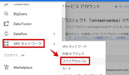 GCP のメニューから「VPCネットワーク」 → 「ファイアウォール」の順にクリックします。