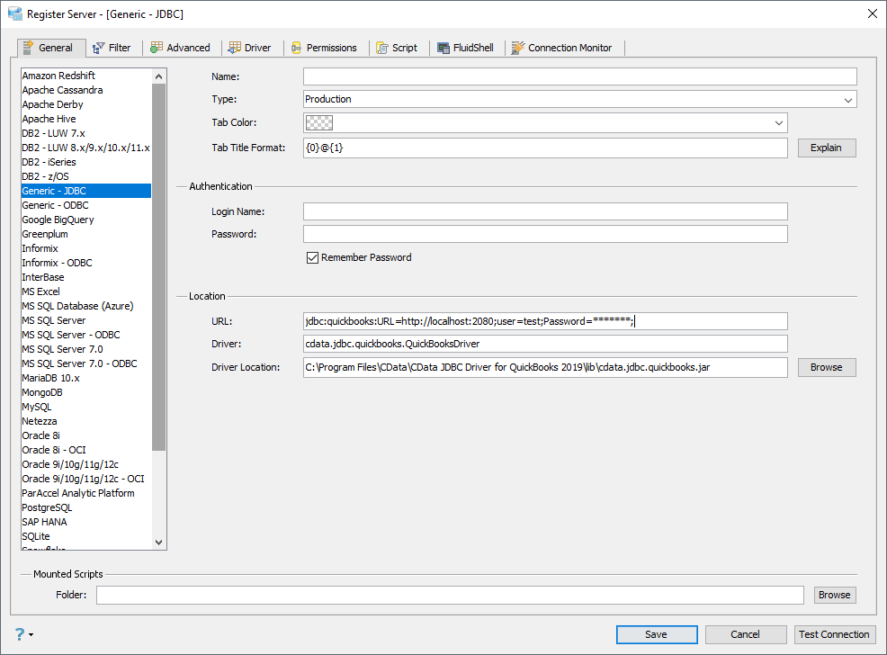 - Register Server フォームで、「Generic - JDBC」接続を選択します。