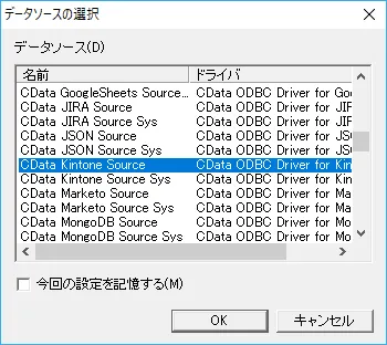- 接続可能なODBC DSN の一覧が表示されるので、先ほど構成したDSNを選択し、「OK」をクリックします。