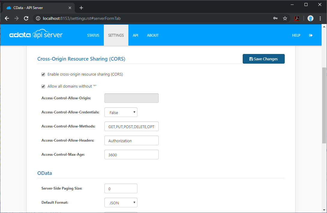 Ajax などのアプリケーションから複数の異なるドメインにアクセス・接続する場合、クロスサイトスクリプティングの制限に抵触する可能性があります。その場合は、Settings -> Server で CORS 設定を行います。