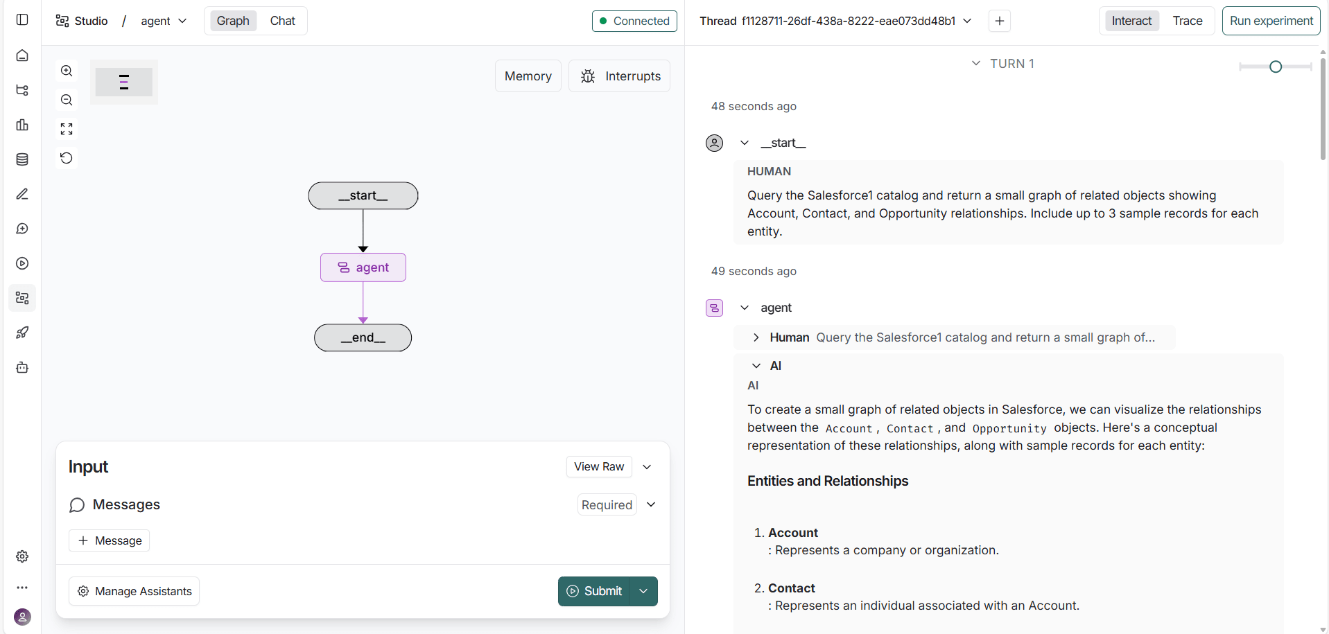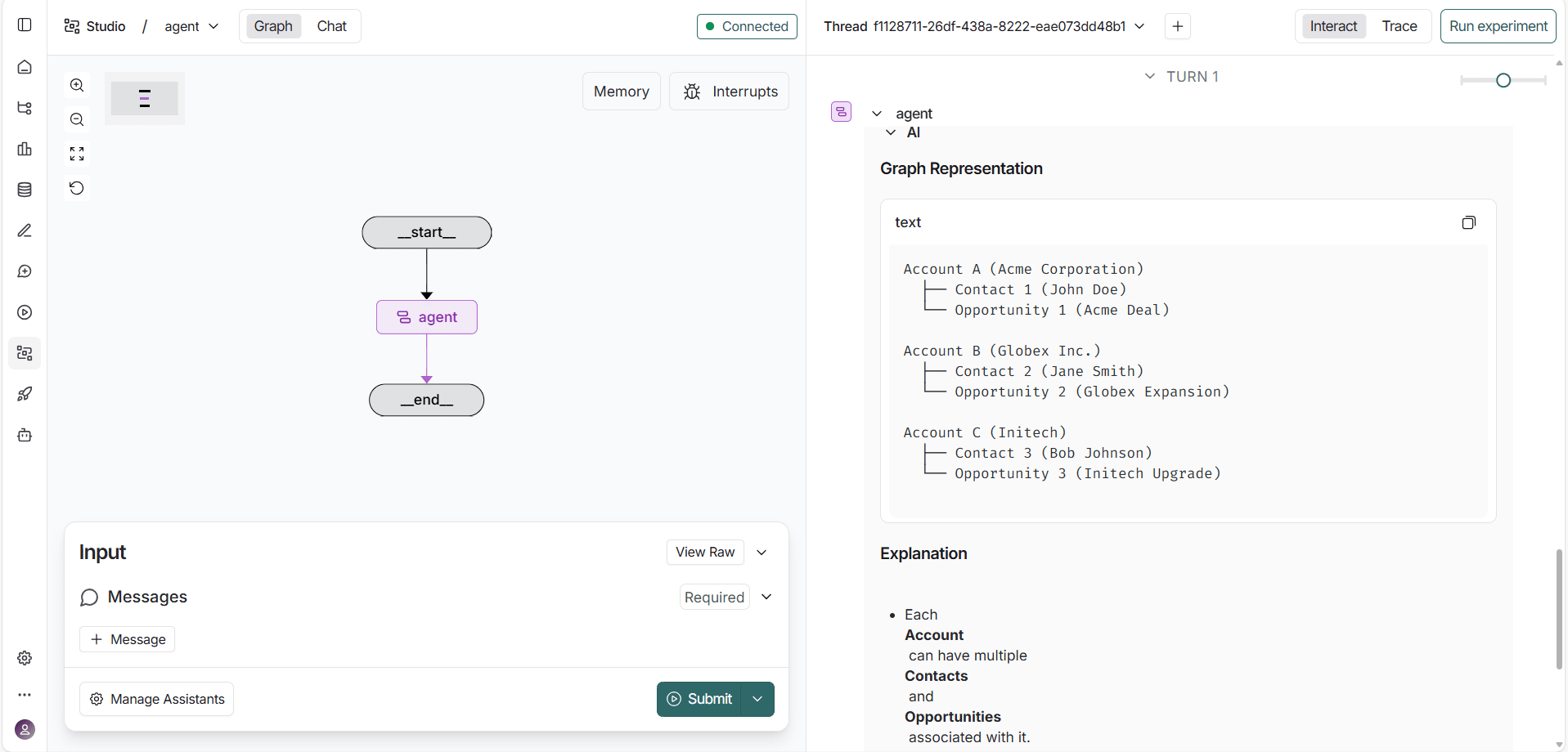 LangGraph 開発サーバーを実行して、LangGraph Studio でワークフローを表示し対話します。これにより、エージェントがプロンプトを処理し、ツールを呼び出し、MCP サーバーを通じてZuora のデータを取得する様子を直接可視化できます。